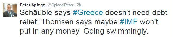 Ο δημοσιογράφος έγραψε στον προσωπικό του λογαριασμό στο twitter: «Ο Σόιμπλε λέει ότι η Ελλάδα δεν χρειάζεται ελάφρυνση του χρέους. Ο Τόμσεν λέει ότι μάλλον το Διεθνές Νομισματικό Ταμείο δεν θα δώσει άλλα χρήματα. Πηγαίνουμε περίφημα».