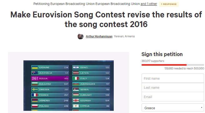Περισσότερα από 360.000 άτομα έχουν υπογράψει στη διαδικτυακή καμπάνια που ξεκίνησε ένας χρήστης από την Αρμενία, αμφισβητώντας τα αποτελέσματα του φετινού Διαγωνισμού Τραγουδιού της Eurovision.