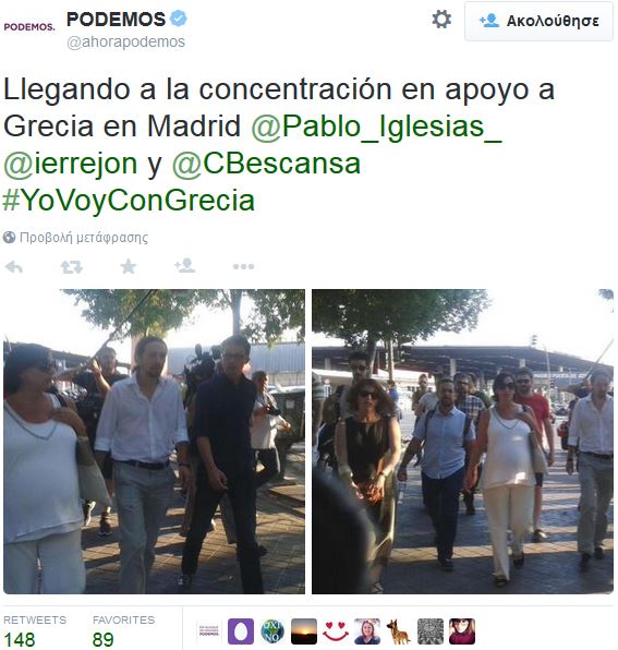 Οι Podemos και η Ενωτική Αριστερά στην Ισπανία διαδήλωσαν το βράδυ του Σαββάτου στο κέντρο της Μαδρίτης για να εκφράσουν την αλληλεγγύη τους στην κυβέρνηση της Αθήνας που ηγείται ο ΣΥΡΙΖΑ.