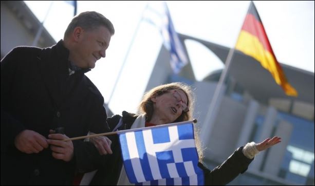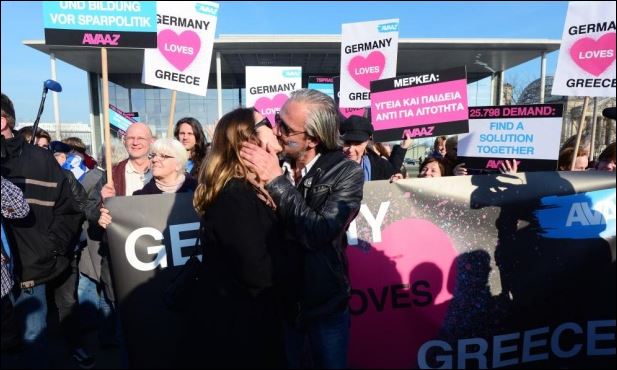 «Η Γερμανία αγαπά την Ελλάδα» γράφει το πανό που κρατούν που κρατούν οι συγκεντρωμένοι. Μάλιστα μπροστά από το πανό φιλήθηκαν ένας Έλληνας και μία Γερμανίδα.
