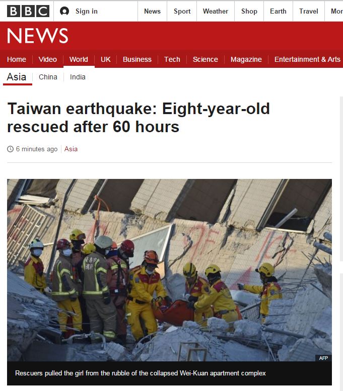 Τα σωστικά συνεργεία στην Ταϊβάν ανέσυραν σήμερα ζωντανό ένα 8χρονο κοριτσάκι που βρισκόταν παγιδευμένο για περισσότερες από 60 ώρες στα ερείπια μιας πολυκατοικίας 17 ορόφων, η οποία είχε καταρρεύσει μετά τον ισχυρό σεισμό που συγκλόνισε τη νότια Ταϊβάν τις πρώτες ώρες του Σαββάτου.
