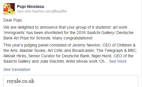 Αξίζει να σημειωθεί ότι το συγκεκριμένο έργο, επιλέχθηκε από την Saatchi Gallery στο Λονδίνο ανάμεσα στους 20 φιναλίστ (από μια λίστα 22.000 έργων) οι οποίοι θα εκθέσουν στη βρετανική μητρόπολη μεταξύ 3 και 9 Μαρτίου -στις 3/3 θα δοθούν και τα 3 πρώτα βραβεία στα έργα που θα επιλεγούν για τα «2016 Saatchi Gallery/ Deutsche Bank Art Prize».