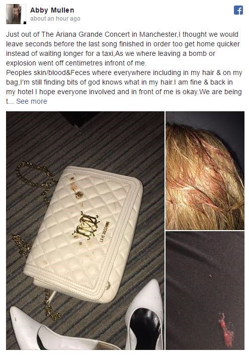 Ο Andy Holey, ο οποίος ήταν στη συναυλία με τη σύζυγο και την κόρη του, ανέφερε στο BBC ότι η έκρηξη σημειώθηκε δίπλα στα εκδοτήρια των εισιτηρίων και πως τον εκτίναξε το ωστικό κύμα. “Όταν σηκώθηκα είδα τριγύρω μου δεκάδες ανθρώπους πεσμένους στο έδαφος” είπε.