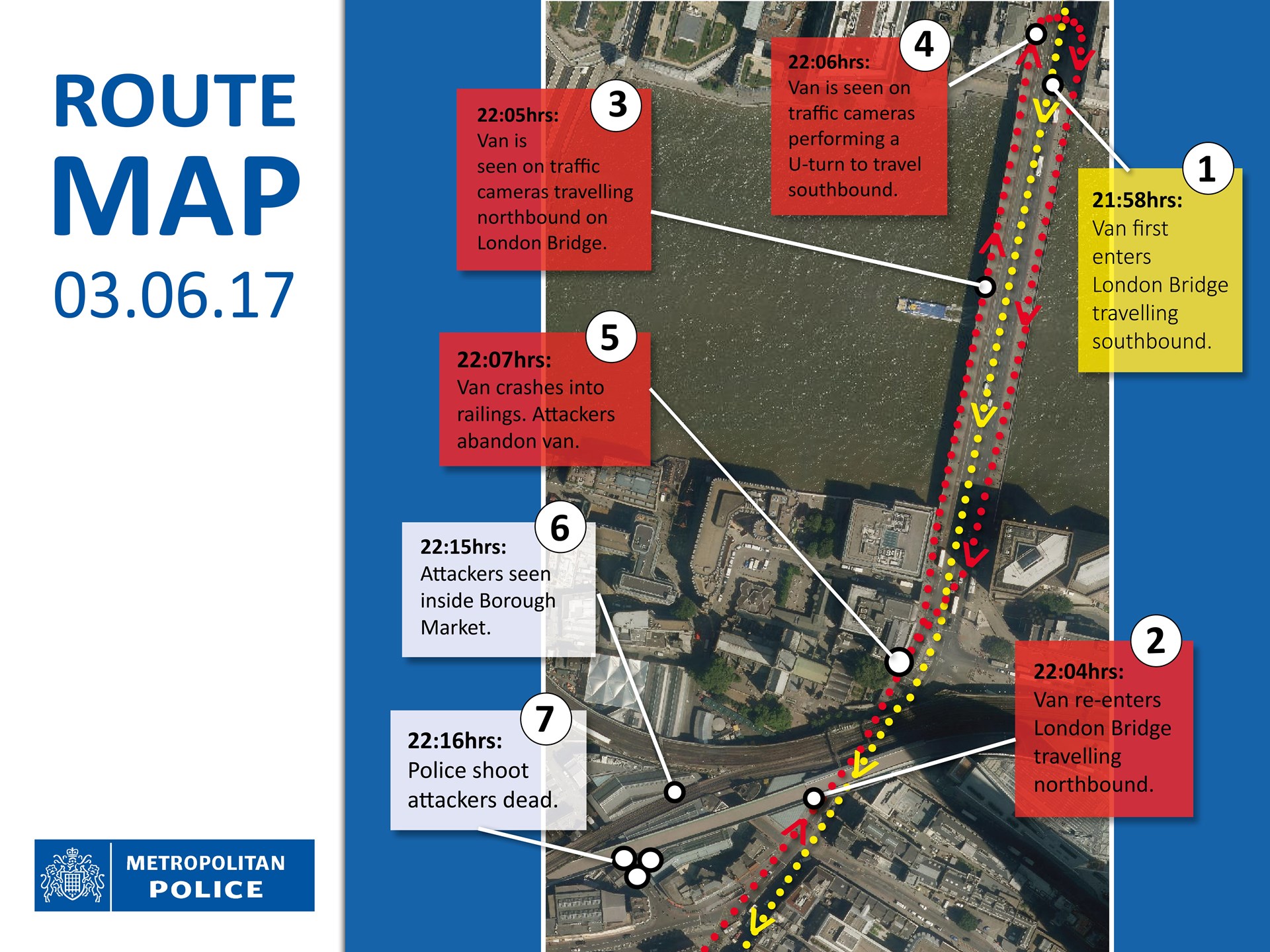 Στη δημοσιότητα δόθηκε, επίσης, ένας χάρτης της διαδρομής των δραστών της τρομοκρατικής επίθεσης της 3ης Ιουνίου. Οι Βρετανοί αστυνομικοί εντόπισαν μαχαίρια κοντά στους τρεις τρομοκράτες.