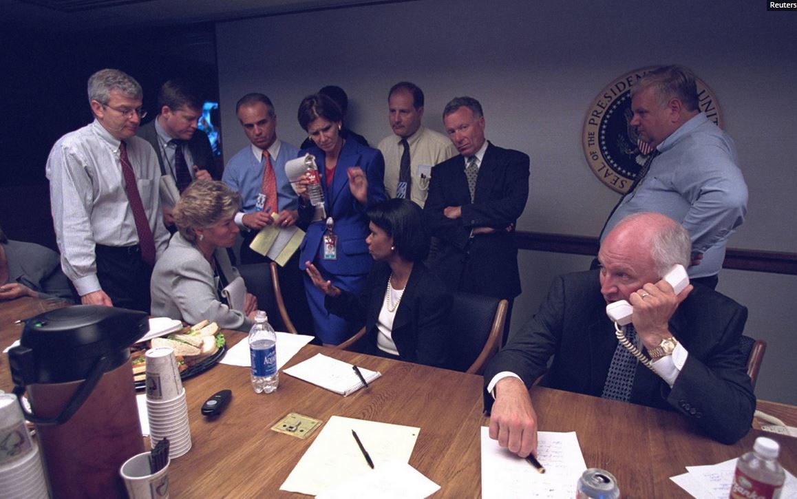 Στις φωτογραφίες καταγράφονται οι πρώτες αντιδράσεις, των τότε κυβερνητικών αξιωματούχων, όπως του Προέδρου των ΗΠΑ, Τζόρτζ Μπους, της Συμβούλου Εθνικής Ασφαλείας Κοντολίζα Ράις, του αντιπροέδρου Ντικ Τσένεϊ, αλλά και του διευθυντή της CIA, Τζορτζ Τένετ κυρίως μέσα από το κέντρο επιχειρήσεων.