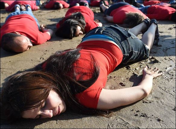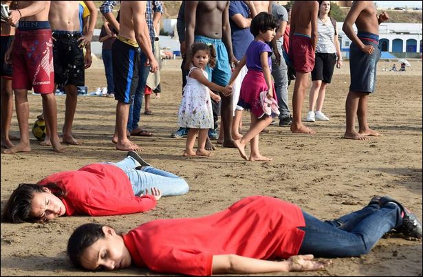 Άνδρες και γυναίκες κάθε ηλικίας φόρεσαν ίδια ρούχα με αυτά που φορούσε ο Αϊλάν και ξάπλωσαν στην άμμο, σε μία ένδειξη διαμαρτυρίας για τη μεταναστευτική πολιτική της Ευρώπης.
