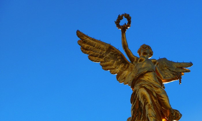 Στην κορυφή του μνημείου στέκεται ένα χρυσό άγαλμα της ελληνικής θεάς Νίκης που στο δεξί της χέρι κρατάει ένα στεφάνι που συμβολίζει την νίκη ενώ στο αριστερό κρατά μια σπασμένη αλυσίδα, που συμβολίζει την ελευθερία.