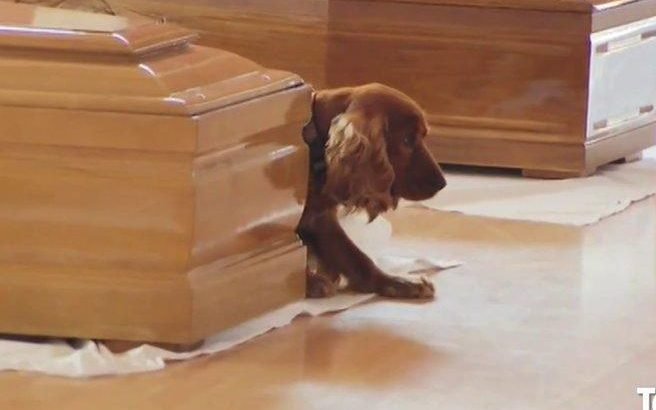 Τριάντα τέσσερα φέρετρα βρίσκονται στο εσωτερικό ενός γυμναστηρίου στο Ασκόλι Πιτσένο της Ιταλίας και δίπλα σε ένα από αυτά στέκεται ακούραστος φρουρός ένα σκυλάκι αφοσιωμένο μέχρι τέλους στον ιδιοκτήτη του.