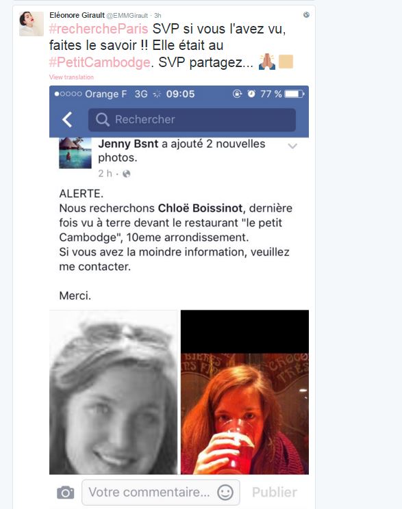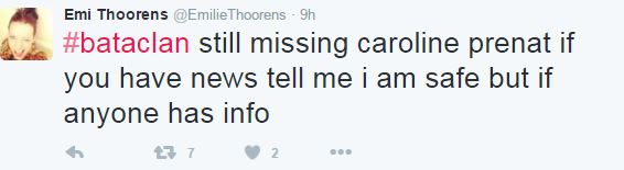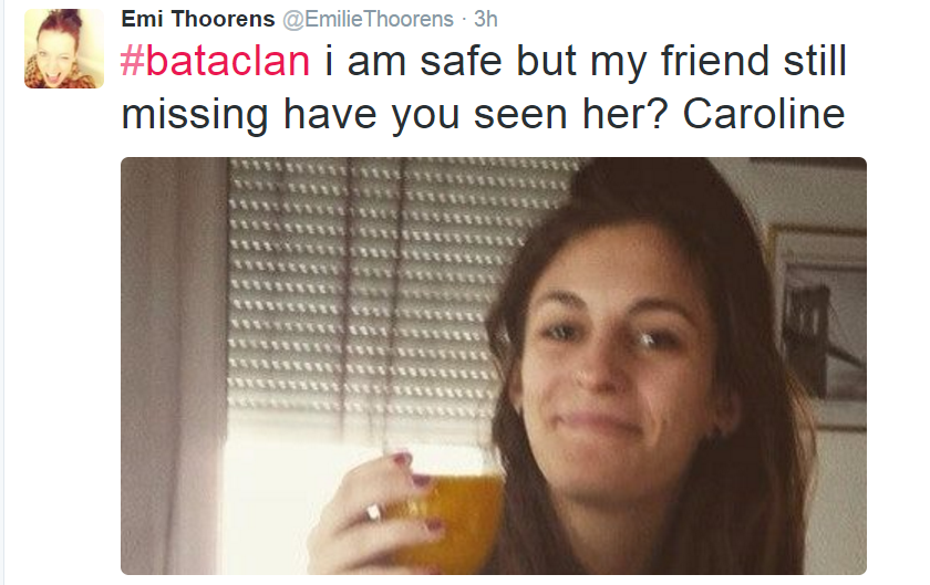 Χαρακτηριστικό είναι το μήνυμα μια κοπέλας που ήταν στο Bataclan. “Εγώ είμαι ασφαλής αλλά η φίλη μου αγνοείται. Την έχετε δει. Εάν έχετε νέα της ενημερώστε με”.