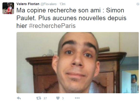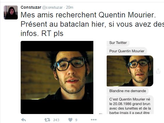 “Οι φίλοι μου αναζητούν τον Quentin Mourier. Ήταν στο Bataclan χθες, εάν έχετε πληροφορίες. Παρακαλώ κάντε Retweet.”, γράφει μια άλλη χρήστης του Twitter.