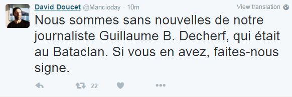 “Δεν έχουμε νέα για τον δημοσιογράφο μας Guillaume Decherf, ο οποίος ήταν στο Bataclan. Εάν έχετε νέα του, ενημερώστε μας”, γράφει ο βοηθός αρχισυντάκτη της γαλλικής ιστοσελίδας lesinrocks.com
