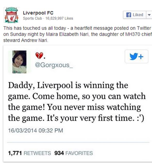 Η επίσημη σελίδα της Λίβερπουλ στο twitter δημοσίευσε ένα από πολύ συγκινητικό μήνυμα ενός κοριτσιού, του οποίου ο πατέρας ήταν επικεφαλής των συνοδών αέρος στο Boeing των Μαλαισιανών αερογραμμών που έχει εξαφανιστεί από τις 8 Μαρτίου.