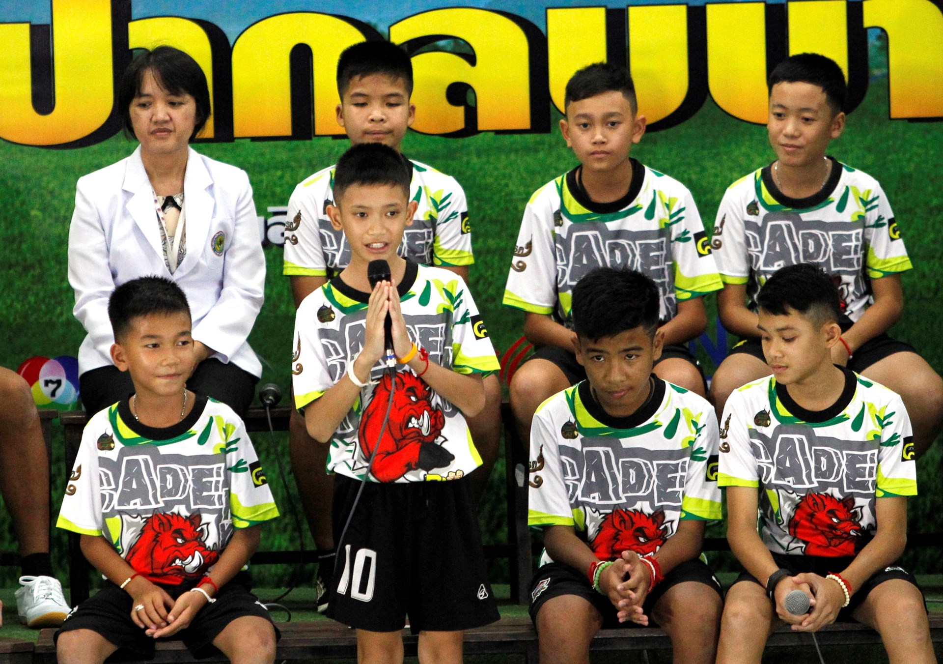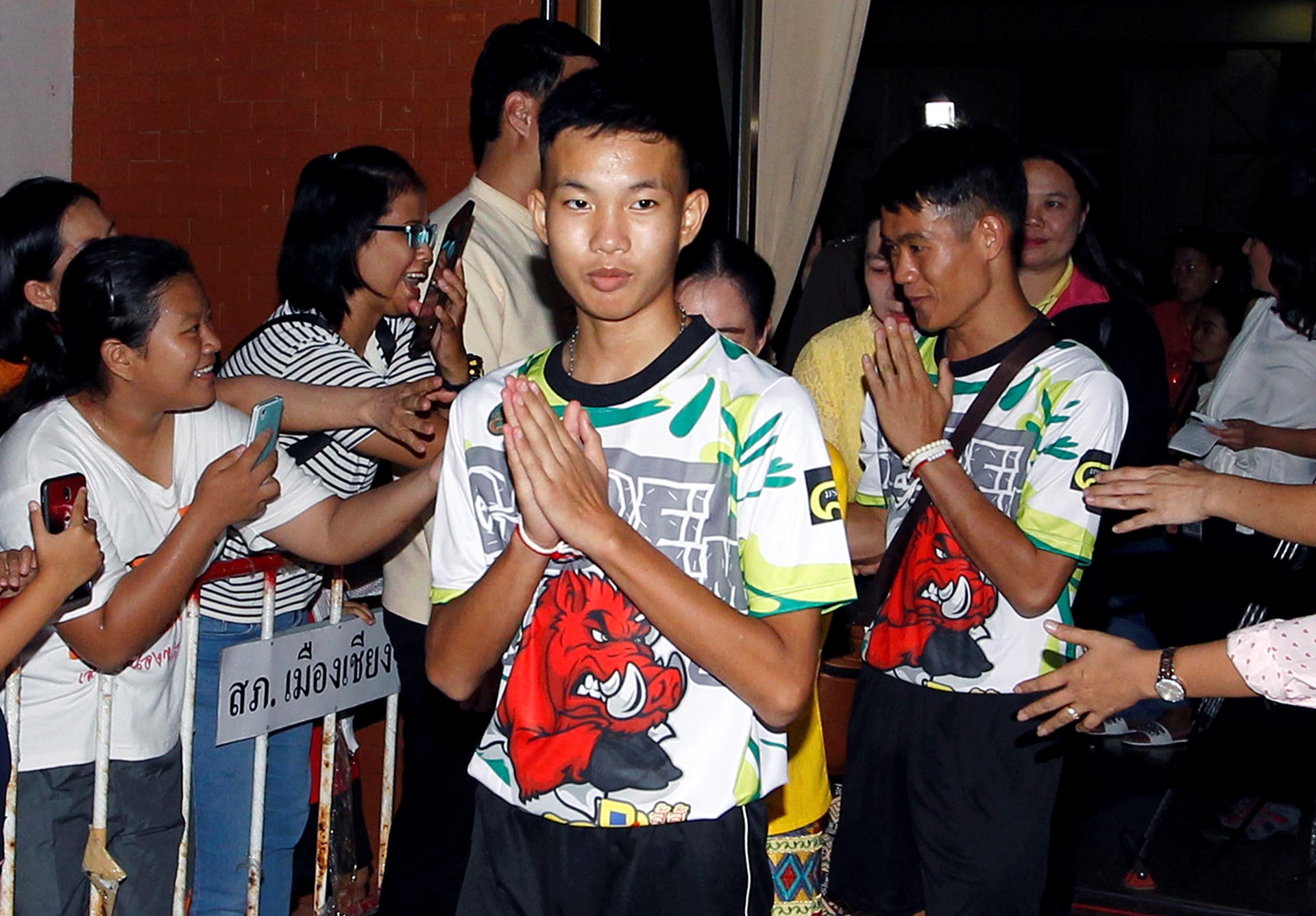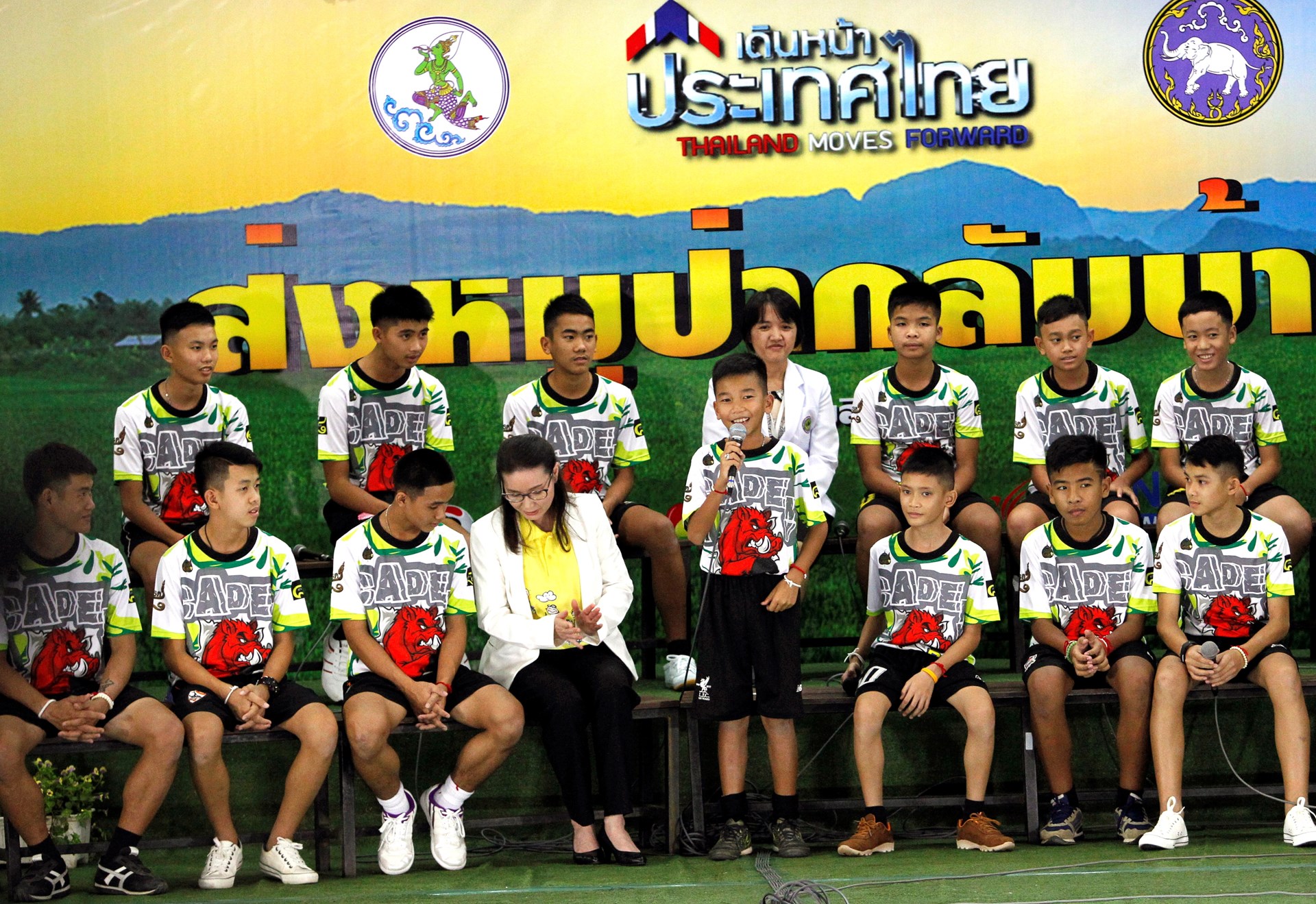 Δεκτά με χειροκροτήματα από δημοσιογράφους και συμμαθητές τους έγιναν τα 12 παιδιά τη στιγμή που εμφανίστηκαν στην αίθουσα όπου έδωσαν συνέντευξη Τύπου μετά την περιπέτειά τους, αφού έμειναν 17 ημέρες εγκλωβισμένα στο σπήλαιο Ταμ Λουάνγκ της βόρειας Ταϊλάνδης.