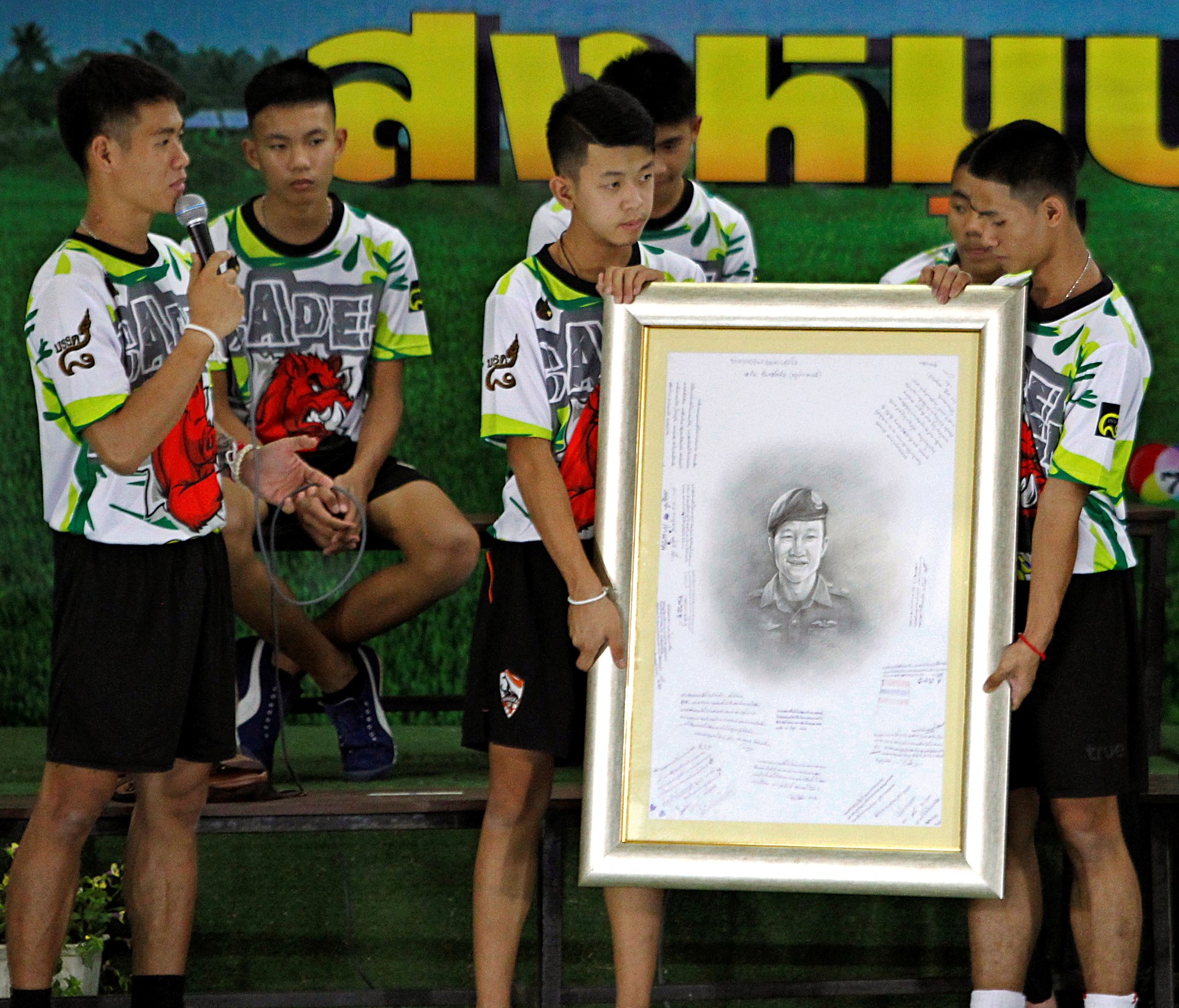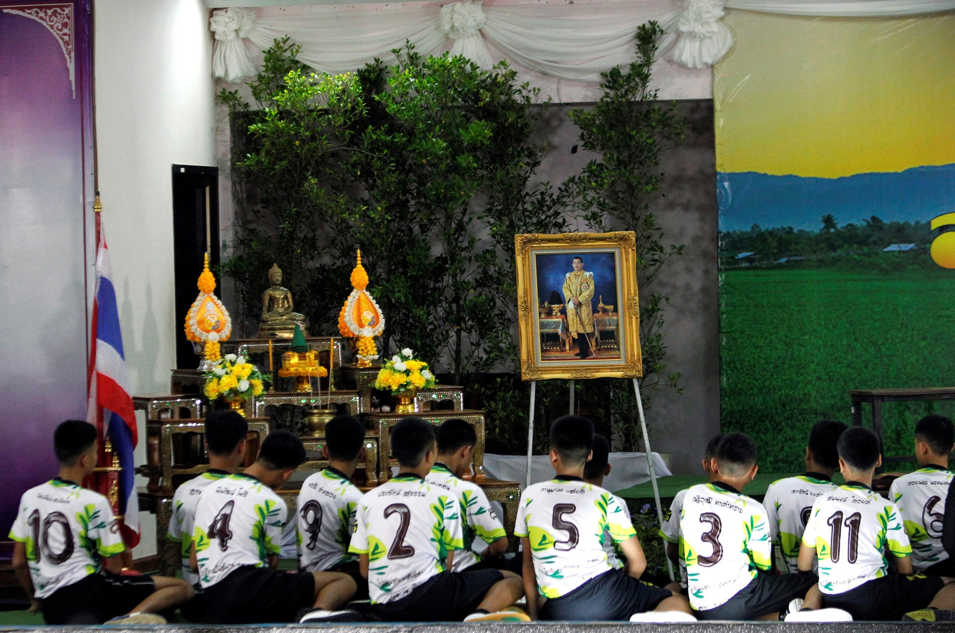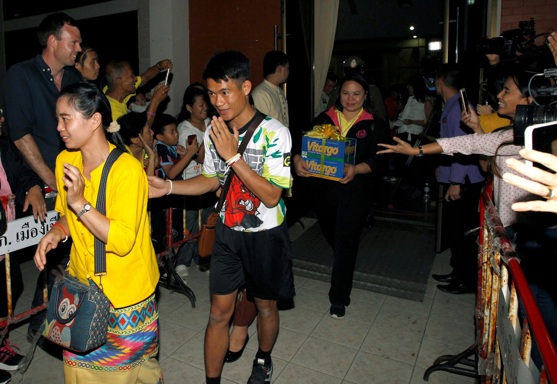 Δεκτά με χειροκροτήματα από δημοσιογράφους και συμμαθητές τους έγιναν τα 12 παιδιά τη στιγμή που εμφανίστηκαν στην αίθουσα όπου έδωσαν συνέντευξη Τύπου μετά την περιπέτειά τους, αφού έμειναν 17 ημέρες εγκλωβισμένα στο σπήλαιο Ταμ Λουάνγκ της βόρειας Ταϊλάνδης.