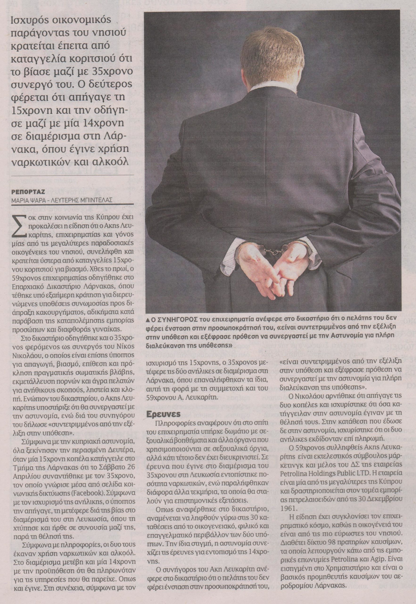 Σοκ στην κοινωνία της Κύπρου έχει προκαλέσει η είδηση ότι ο Άκης Λευκαρίτης, επιχειρηματίας και γόνος μίας από τις μεγαλύτερες παραδοσιακές οικογένειες του νησιού, συνελήφθη και κρατείται ύστερα από καταγγελίες 15χρονου κοριτσιού για βιασμό.
