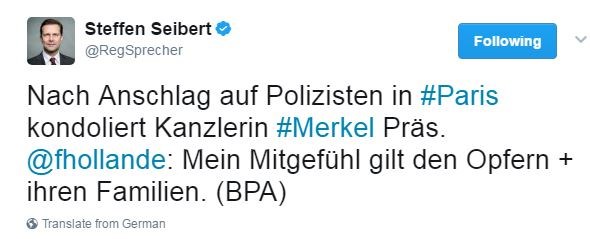 “Η καγκελάριος Μέρκελ εκφράζει τα συλλυπητήριά της στον Φρανσουά Ολάντ μετά την επίθεση σε αστυνομικούς στο Παρίσι: Εκφράζω τα συλλυπητήριά μου στα θύματα & τις οικογένειές τους”, έγραψε στο Twitter ο Ζάιμπερτ.