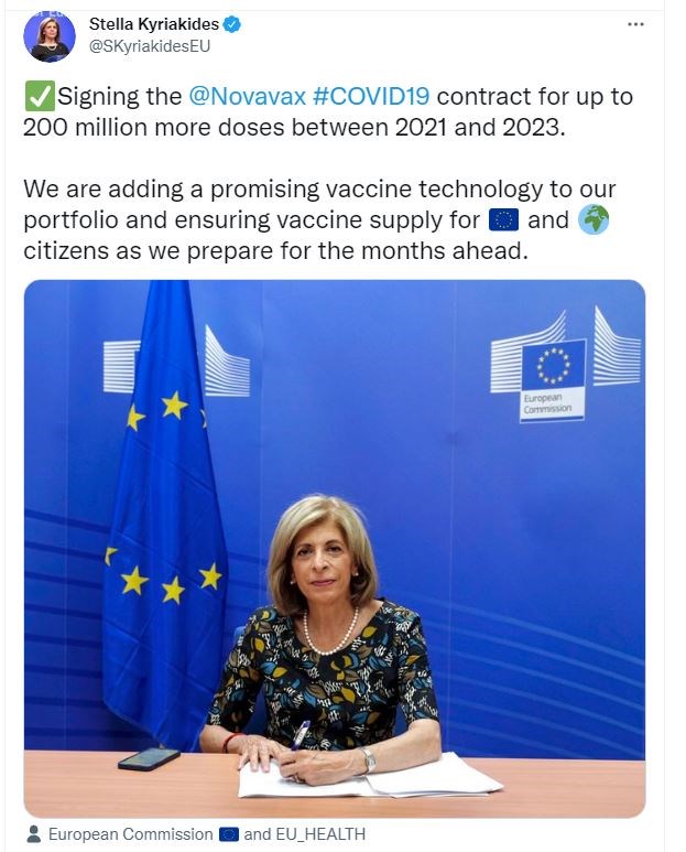 Tη σύμβαση της ΕΕ με την αμερικανική φαρμακευτική εταιρεία Novavax για την προμήθεια έως και 200 εκατ. δόσεων εμβολίων κατά της covid-19 για το 2021-2023 υπέγραψε η Eπίτροπος αρμόδια για θέματα υγείας, Στέλλα Κυριακίδου. Σημειώνεται πως το εμβόλιο έχει ελεγχθεί και λάβει την έγκριση του Ευρωπαϊκού Οργανισμού Φαρμάκων ως ασφαλές και αποτελεσματικό.