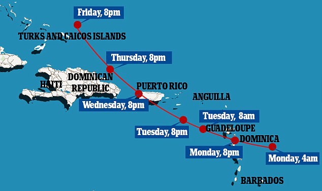 Όπως αναφέρουν οι μετεωρολόγοι του NHC, τις επόμενες ώρες οι άνεμοι του κυκλώνα Μαρία αναμένεται να πλήξουν τη Γουαδελούπη και τη Μαρτινίκα.