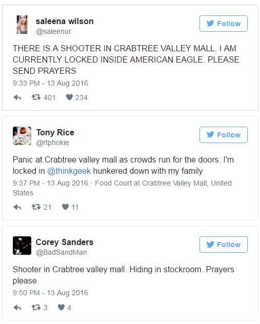 Άτομα που βρίσκονταν μέσα στο εμπορικό κέντρο την ώρα του περιστατικού ανέφεραν στο Twitter ότι άκουσαν τους πυροβολισμούς και ότι κρύβονται καθώς φοβούνται για τη ζωή τους.