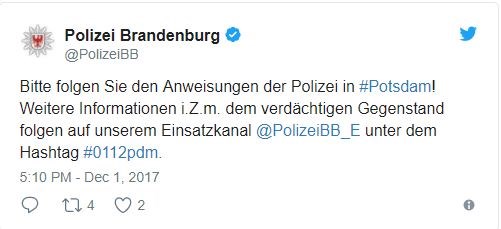 Όπως ενημερώνει σε tweet της η αστυνομία του Βραδεμβούργου, στο σημείο έχουν σπεύσει δυνάμεις της. Η αγορά εκκενώνεται και ζητά από τους πολίτες να μην κατευθυνθούν στο σημείο. Δείτε το tweet της τοπικής αστυνομίας: