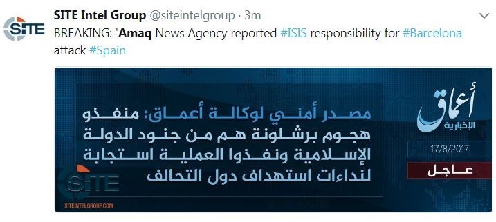 Η επίθεση της Βαρκελώνης πραγματοποιήθηκε από στρατιώτες του Ισλαμικού Κράτους», αναφέρεται στην ανακοίνωση και προστίθεται ότι η επιχείρηση πραγματοποιήθηκε σε ανταπόκριση της έκκλησης να πληγούν τα κράτη του διεθνούς συνασπισμού που επιχειρεί στη Συρία και το Ιράκ.