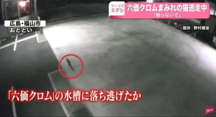 Η γάτα… που φαινομενικά εξάντλησε μια από τις εννέα ζωές της, πιστεύεται ότι έπεσε σε μια δεξαμενή λιωμένου χρωμίου στο εργοστάσιο Nomura Plating το Σαββατοκύριακο.