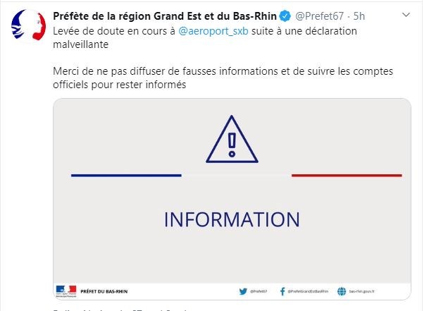 Σύμφωνα με την ενημέρωση από την περιφέρεια του Κάτω Ρήνου, το αεροδρόμιο του Στρασβούργου-Εντζέμ δέχτηκε αργά το πρωί ένα «κακόβουλο» μήνυμα ηλεκτρονικού ταχυδρομείου που αναφερόταν στην τοποθέτηση βόμβας στον χώρο του.