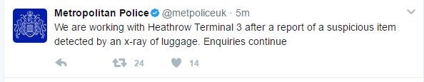 “Σε συνεργασία με το προσωπικό του Τερματικού 3 του αεροδρομίου Χίθροου ερευνούμε την αναφορά για ένα ύποπτο αντικείμενο που ανιχνεύτηκε έπειτα από έλεγχο ακτίνων Χ. Οι έρευνες είναι σε εξέλιξη” αναφέρει σε ανάρτηση της στο Twitter η Μητροπολιτική Αστυνομία του Λονδίνου.