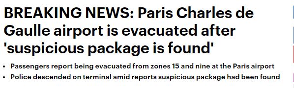 Οι Αρχές προχώρησαν στην εκκένωση του αεροδρομίου Σαρλ ντε Γκωλ στο Παρίσι λόγω ύποπτου δέματος.