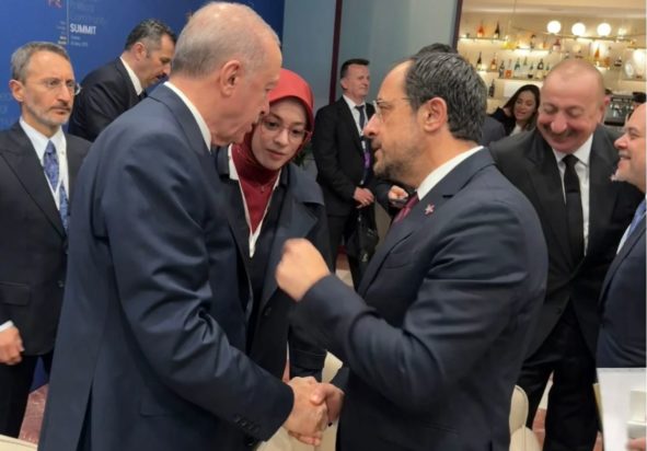 Σύντομη συνομιλία είχε την Παρασκευή ο Πρόεδρος της Κύπρου, Νίκος Χριστοδουλίδης, με τον Πρόεδρο της Τουρκίας, Ρετζέπ Ταγίπ Ερντογάν, στο περιθώριο της Συνόδου Κορυφής της Ευρωπαϊκής Πολιτικής Κοινότητας, στα Τίρανα στην Αλβανία.