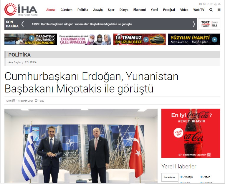 Στη διάρκεια της συνάντησης Μητσοτάκη – Ερντογάν και στο γεγονός ότι αυτή έγινε με κλειστές πόρτες αναφέρονται τα τουρκικά ΜΜΕ χωρίς να κάνουν μέχρι στιγμής την παραμικρή αναφορά στο περιεχόμενο της συζήτησης των δύο ηγετών.