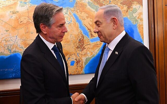 Ο Πρωθυπουργός του Ισραήλ Μπενιαμίν Νετανιάχου και ο υπουργός Εξωτερικών των ΗΠΑ Άντονι Μπλίνκεν συζήτησαν σήμερα την «ανάγκη» να «ενώσουν τις δυνάμεις τους» οι δύο χώρες απέναντι στην «ιρανική απειλή», σύμφωνα με την ανακοίνωση που εξέδωσε το πρωθυπουργικό γραφείο, στο πλαίσιο της συνάντησης των δύο ανδρών για τον πόλεμο στην Μέση Ανατολή.