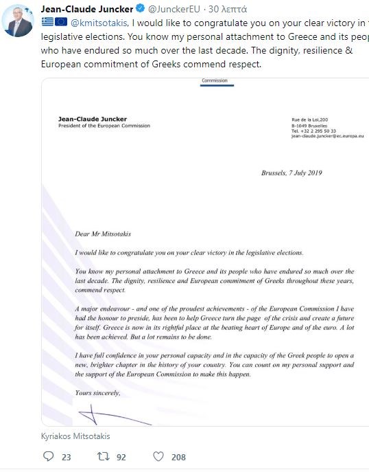 Η συγχαρητήρια επιστολή του κ. Γιούνκερ, την οποία ανάρτησε στον προσωπικό του λογαριασμό στο Twitter, έχει ως εξής: