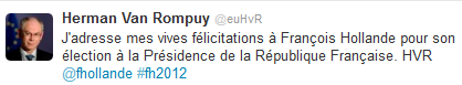 Τα συγχαρητήριά του στο νεοεκλεγέντα Γάλλο πρόεδρο, Φρανσουά Ολάντ έδωσε μέσω Twitter ο πρόεδρος του Ευρωπαϊκής Ένωσης, Χέρμαν Βαν Ρομπέι.ΔΕΙΤΕ ΤΙ ΕΓΡΑΨΕ