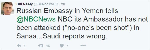 Ωστόσο, η ρωσική πρεσβεία στην Υεμένη ξεκαθάρισε στο αμερικανικό δίκτυο NBC ότι «ο πρέσβης δεν έχει δεχθεί καμία επίθεση στη Σαναά», διαψεύδοντας τα δημοσιεύματα.