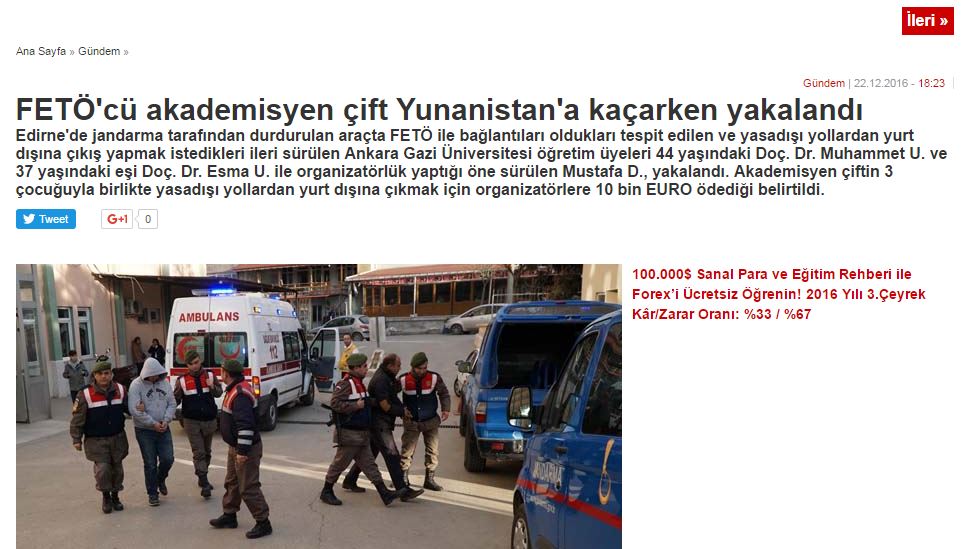 Σύμφωνα με το ρεπορτάζ της Milliyet, οι τέσσερις συλληφθέντες, δύο άνδρες και δύο γυναίκες, εργάζονταν στο πανεπιστήμιο της Άγκυρας. Οι αρχές είχαν ενδείξεις ότι τα άτομα αυτά συνδέονται με την FETO, ότι είναι γκιουλενιστές. Τα είχαν υπό στενή παρακολούθηση με αποτέλεσμα να τα συλλάβουν λίγο πριν την αναχώρηση τους για τη χώρα μας.