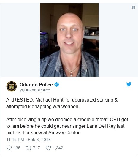 “Όταν συνελήφθη, ο Χαντ είχε στην κατοχή του εισιτήρια για την συναυλία της Λάνα Ντελ Ρέι και ένα μαχαίρι”, αναφέρει η ανακοίνωση της αστυνομίας και προσθέτει ότι ο Χαντ δεν είχε έρθει ποτέ σε επαφή με την 32χρονη τραγουδίστρια. Δείτε τη φωτογραφία του συλληφθέντα: