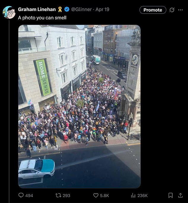 Στις 20 Απριλίου έγραψε: «Αν ένας άνδρας που αυτοπροσδιορίζεται ως τρανς βρίσκεται σε χώρο μόνο για γυναίκες, διαπράττει βίαιο, καταχρηστικό έργο. Κάντε σκηνή, καλέστε την αστυνομία και αν όλα αποτύχουν, χτυπήστε τον στα γεννητικά όργανα».