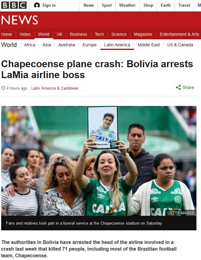 Οι αρχές της Βολιβίας συνέλαβαν τον επικεφαλής της αεροπορικής εταιρείας LaMia, στην οποία ανήκει το αεροσκάφος που συνετρίβη την περασμένη εβδομάδα σκοτώνοντας 71 ανθρώπους, ανάμεσά τους και σχεδόν ολόκληρη την ομάδα της Βραζιλίας Σαπεκοένσε.