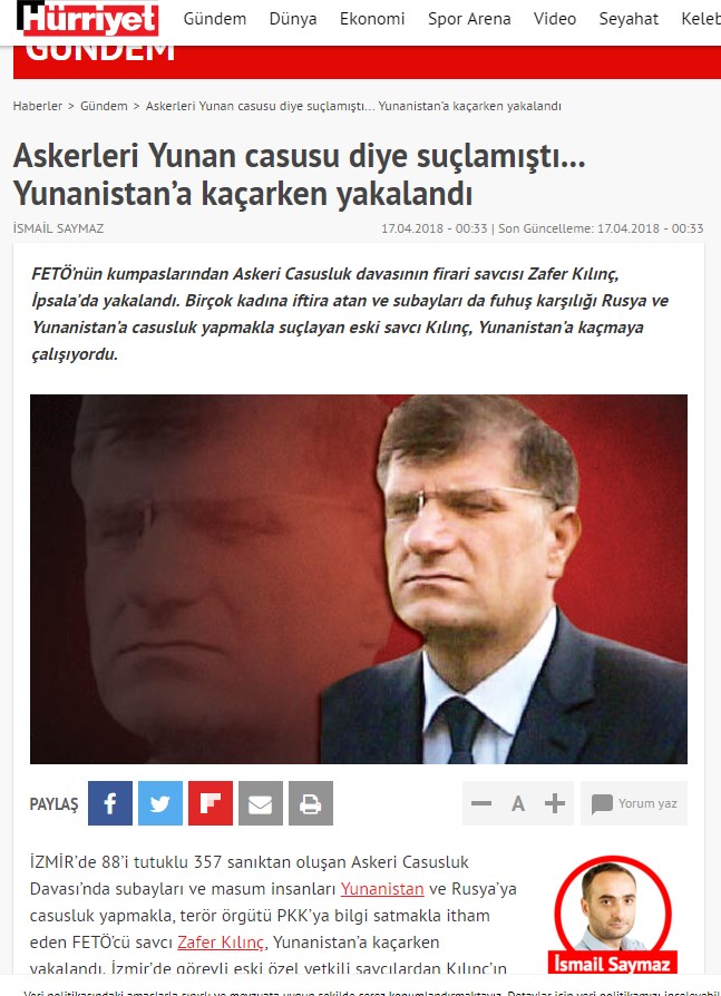 Η αστυνομία τον αναζητούσε εδώ και καιρό με την κατηγορία ότι είναι γκιουλενιστής, καθώς όπως αναφέρεται, είχε αναλάβει μια υπόθεση κατασκοπείας, στην οποία κατηγορείται ότι κατηγορούσε αθώους ανθρώπους και στρατιώτες ως κατασκόπους της Ρωσίας και της Ελλάδας. Συγκεκριμένα, είχε κατηγορήσει περίπου 200 Τούκους αξιωματικούς ως πράκτορες της Ελλάδας.