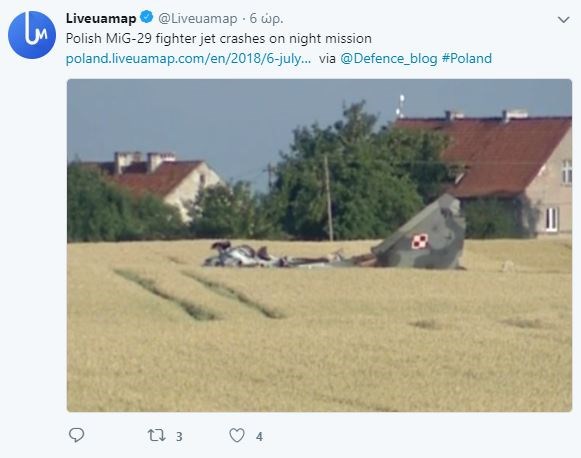 Η πτώση του μαχητικού αεροσκάφους τύπου Mig 29 έγινε κοντά στην βόρεια Πολωνία, στην πόλη Πασλέκ. Τα άσχημα νέα είναι ότι ο πιλότος σκοτώθηκε παρά το γεγονός ότι πρόλαβε να εκτιναχθεί από το κάθισμα.