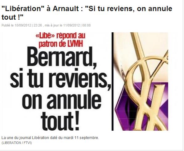 Ο ιδιοκτήτης της αυτοκρατορίας ειδών πολυτελείας LVMH Bernard Arnault πέρασε χθες στην αντεπίθεση δηλώνοντας ότι αποφάσισε να καταθέσει μήνυση κατά της εφημερίδας Liberation για εξύβριση μέσω του χθεσινού πρωτοσέλιδου τίτλου της «Άντε χάσου πλούσιε!» με τον οποίο η εφημερίδα “υποδέχθηκε” την αίτησή του για την απόκτηση της βελγικής υπηκοότητας με στόχο να αποφύγει την φορολόγησή της τεράστιας περιουσίας του στη Γαλλία.”Ο Bernard Arnault δεν έχει άλλη επιλογή, δεδομένης της ακραίας χυδαιότητας και της βιαιότητας του τίτλου της εφημερίδας από το να προσφύγει στη δικαιοσύνη κατά της εφημερίδας. Αυτό το πρωτοσέλιδο της Liberation είναι απαράδεκτο» ανέφερε η ανακοίνωση του γραφείου του.«Bernard, αν γυρίσεις, τα παίρνουμε όλα πίσω», απαντά με τον σημερινό της πρωτοσέλιδο τίτλο η εφημερίδα.