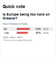 Η ηλεκτρονική σελίδα του αμερικανικού δικτύου CNN διεξάγει ψηφοφορία με το ερώτημα: “Είναι η Ευρώπη υπερβολικά σκληρή απέναντι στην Ελλάδα;”.Έως τώρα το αποτέλεσμα της ψηφοφορίας είναι 54% “όχι” και 46% “ναι”, με μικρή υποχώρηση δηλαδή από το 47% που έφτασαν να έχουν οι ψήφοι “υπέρ” της χώρας μας.