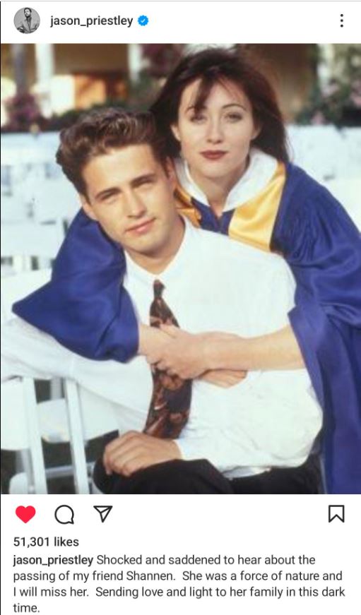 Σοκαρισμένος και λυπημένος δηλώνει ο ηθοποιός Τζέισον Πρίστλεϊ, για τον χαμό της Σάνεν Ντόχερτι, η οποία σε ηλικία μόλις 53 ετών έχασε την μάχη με τον καρκίνο.
