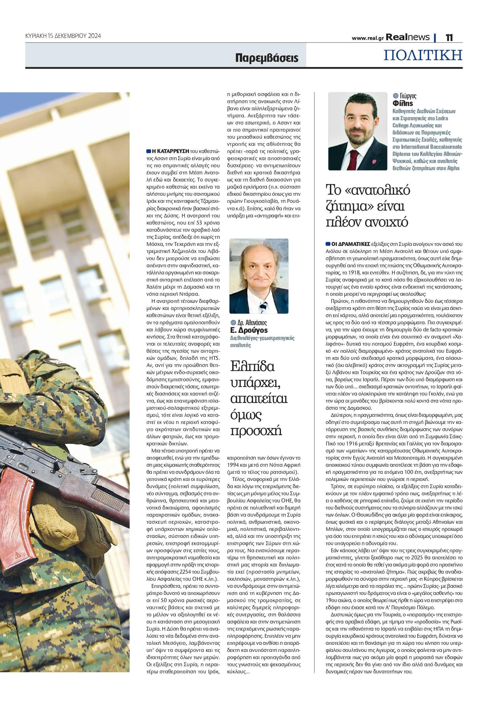 Η κρίση στη Συρία προκαλεί έντονες γεωπολιτικές αναταράξεις, με σοβαρές προεκτάσεις που επηρεάζουν αναπόφευκτα και την Ελλάδα. Οι εντάσεις στην ανατολική Μεσόγειο, οι μεταναστευτικές ροές, οι περιφερειακές συγκρούσεις και οι διεθνείς ανταγωνισμοί απαιτούν στρατηγική διαχείριση από την ελληνική διπλωματία. Τη ρευστή και επικίνδυνη κατάσταση που βρίσκεται σε εξέλιξη στην περιοχή μας αναλύουν με άρθρα τους στη Realnews οι διακεκριμένοι διεθνολόγοι Αλέξανδρος Δεσποτόπουλος, Αθανάσιος Δρούγος και Γιώργος Φίλης.