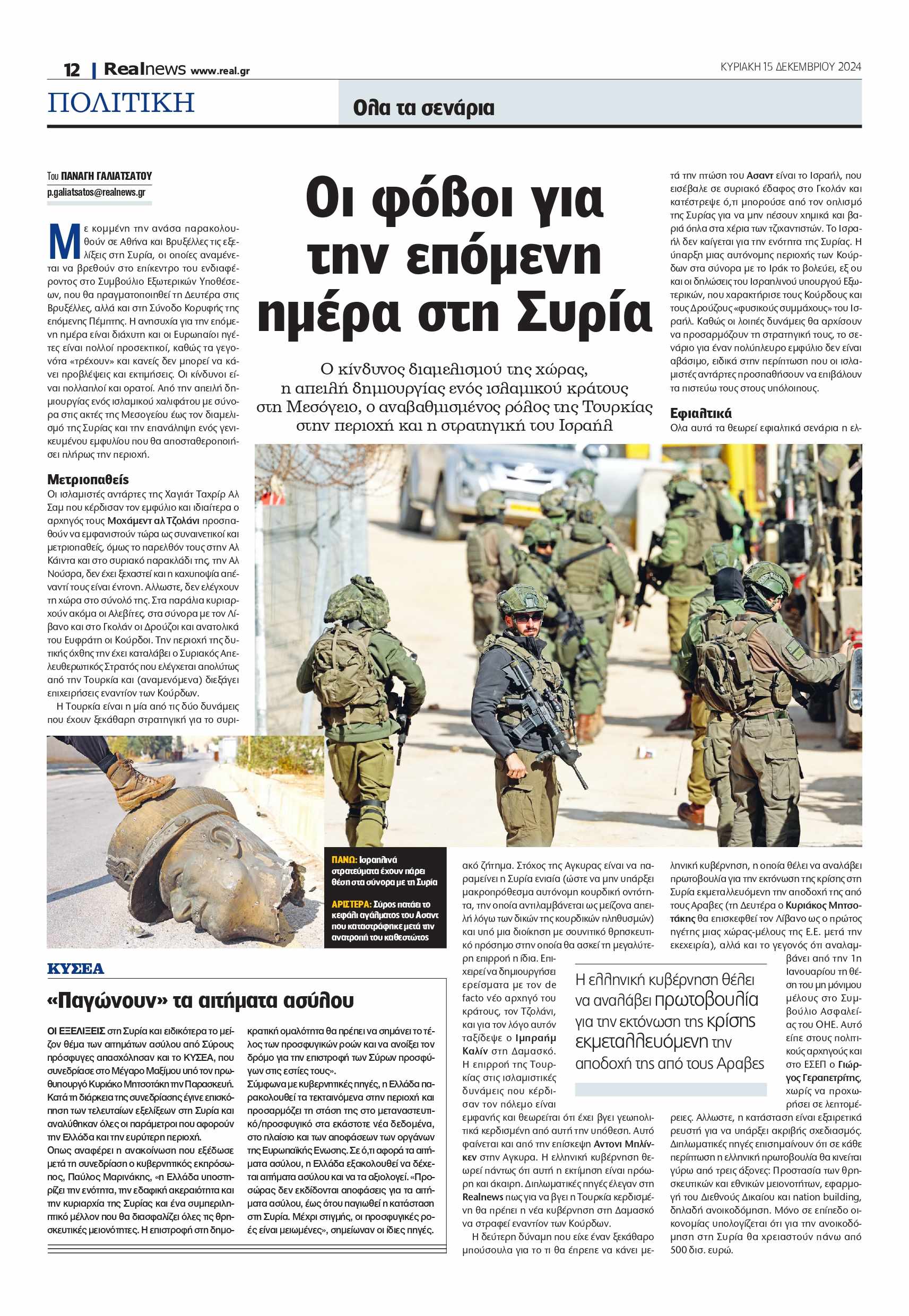 Όλα τα σενάρια για τις εξελίξεις μετά την πτώση του καθεστώτος Άσαντ. Ο κίνδυνος διαμελισμού της χώρας, η απειλή δημιουργίας ενός ισλαμικού κράτους στη Μεσόγειο και ο αναβαθμισμένος ρόλος της Τουρκίας στην περιοχή. Τι αποφάσισε το ΚΥΣΕΑ για τους Σύρους πρόσφυγες στην Ελλάδα. Γράφουν στην «R»: Α. Δεσποτόπουλος, Αθ. Δρούγος, Γ. Φίλης.