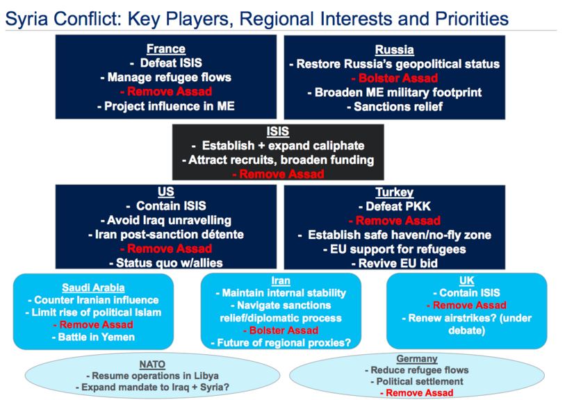 Με αφορμή την κατάρριψη του ρωσικού μαχητικού και το πολεμικό κλίμα ανάμεσα στη Ρωσία και την Τουρκία, η πολιτική αναλύτρια της Citi Research, Τίνα Φόρνταμ, δημιούργησε ένα γράφημα το οποίο παρουσιάζει τους στόχους των πρωταγωνιστών στον συριακό εμφύλιο.