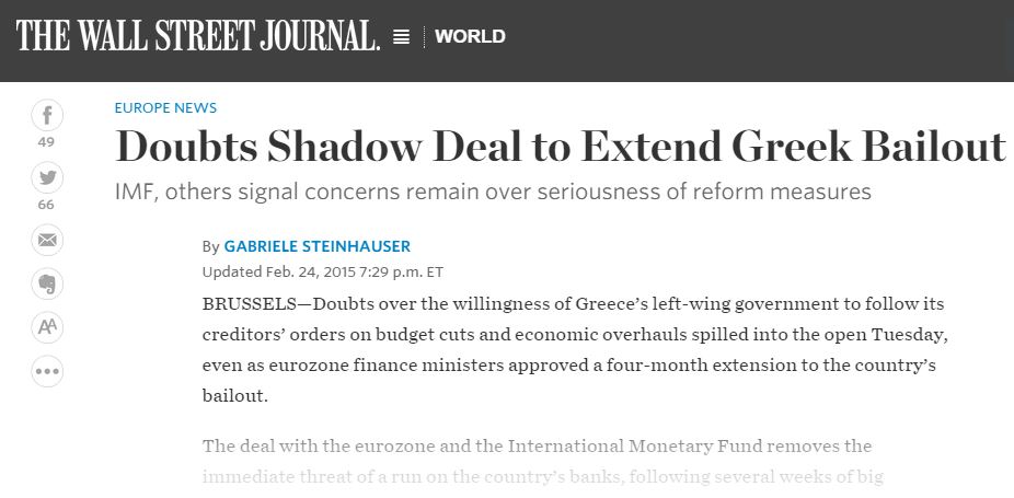 Σε ανταπόκριση από τις Βρυξέλλες στη Wall Street Journal αναφέρεται ότι, «σύμφωνα με δύο Ευρωπαίους αξιωματούχους που δεν κατονομάζονται, οι υπουργοί Οικονομικών της ευρωζώνης ενέκριναν την παράταση κατά τέσσερις μήνες, μέχρι το τέλος Ιουνίου, του προγράμματος διάσωσης της Ελλάδας, αλλά η συμφωνία που επιτεύχθηκε πρέπει να εγκριθεί από τα κοινοβούλια μερικών χωρών της ευρωζώνης, όπως είναι αυτά της Γερμανίας και της Φινλανδίας. Παρά την έγκριση της λίστας των μεταρρυθμίσεων, η Αθήνα εξακολουθεί να αντιμετωπίζει διάφορα εμπόδια προτού μπορέσει να λάβει νέα δόση από το πρόγραμμα διάσωσης».