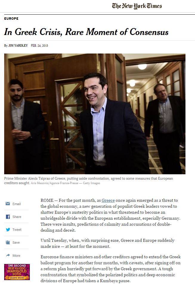 Σε ανταπόκριση από τις Βρυξέλλες στη New York Times επισημαίνεται ότι «οι υπουργοί Οικονομικών της Ευρωζώνης ενέκριναν τις ελληνικές προτάσεις που αποσκοπούν στην άμβλυνση των δυσμενών επιπτώσεων που δημιουργήθηκαν από το πρόγραμμα διάσωσης, επεκτείνοντας το εν λόγω πρόγραμμα κατά τέσσερις μήνες».