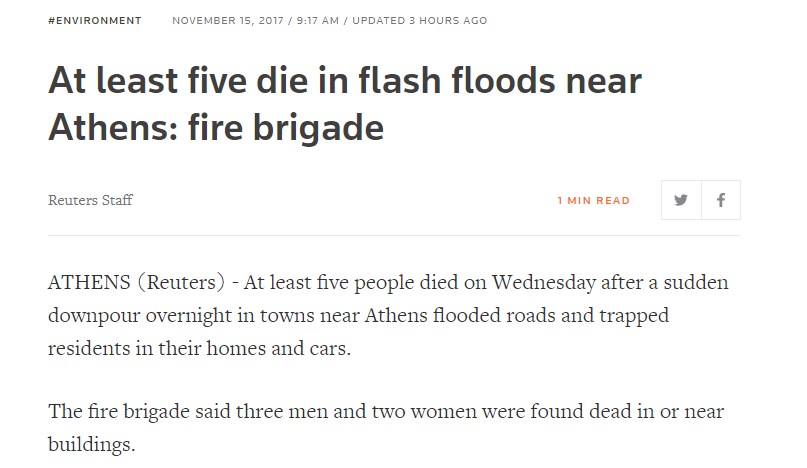 Στον διαρκώς αυξανόμενο αριθμό των νεκρών από τη φονική κακοκαιρία στη Δυτική Αττική αναφέρονται τα διεθνή ΜΜΕ. Το πρακτορείο Reuters κάνει λόγο για δρόμους και σπίτια που πλημμύρισαν, με αποτέλεσμα άνθρωποι να χάσουν τη ζωή τους και άλλοι να εγκλωβιστούν στα σπίτια ή στα αυτοκίνητά τους.